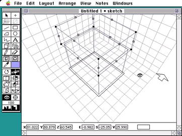 9. アイツールを選んで、クロスヘアを動かして、自分がつくった作品を鑑賞すると同時に、DesignWorkshopのダイナミックな視点移動を楽しんでください。十分楽しんだら、モデルをつくったときように、東立面が見える俯瞰の視点に戻してください。