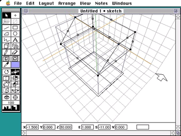 この3次元クロスヘアが、DesignWorkshopのモデリングの基本ツールです。マウスを前に動かすと、クロスヘアはモデリング空間の奥へと移動し、マウスを手前に引っ張るとクロスヘアも手前、すなわち南側に移動します。3次元クロスヘアが、パースペクティブに見えるモデリング空間の中であちこちへ動くのを観察してみてください。