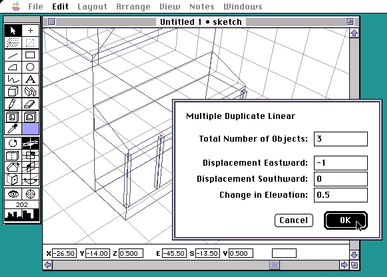 残りの段をつくるために、柱の複製で使った配列複製を行います。編集から配列複製を選んで、下図に現れている数値を打ち込んでください。(複製後のオブジェクト数=3、東西方向への配置=-1、南北方向への配置=0、高さの変位=0.5)